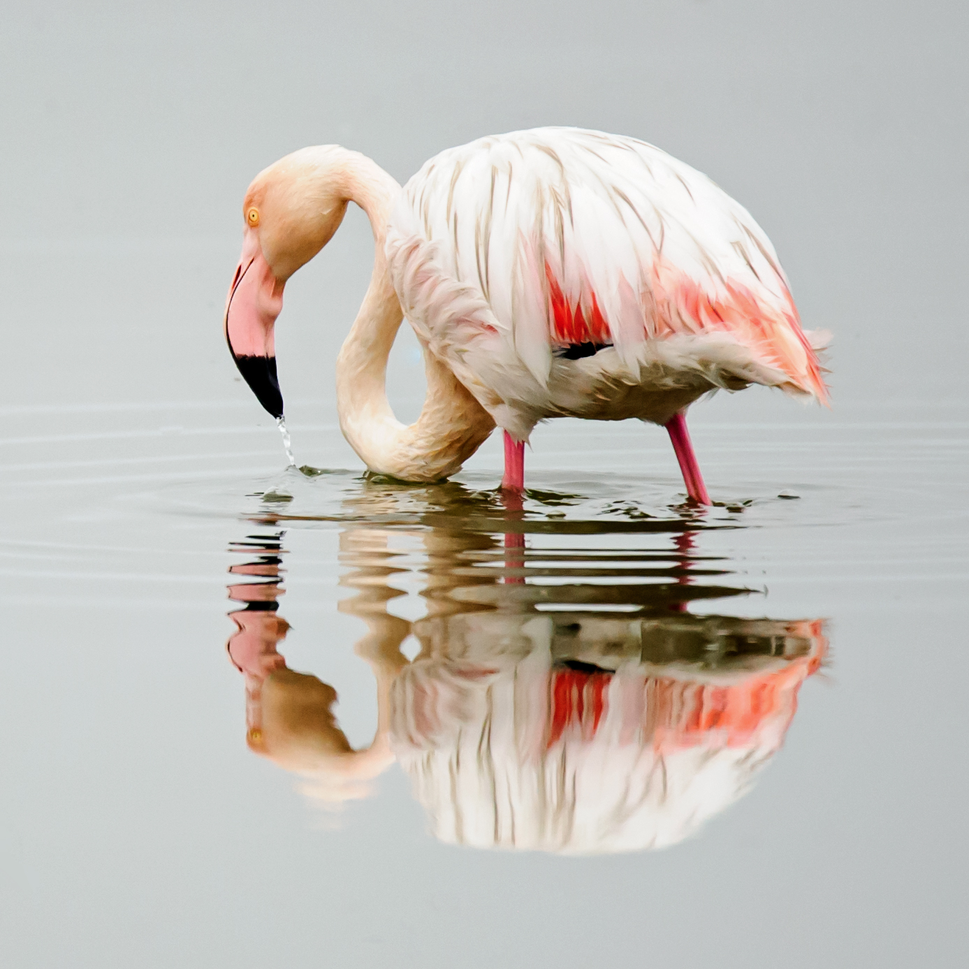 A beautiful reflection of a greater flamingo, taken in Walvis Bay, Namibia.